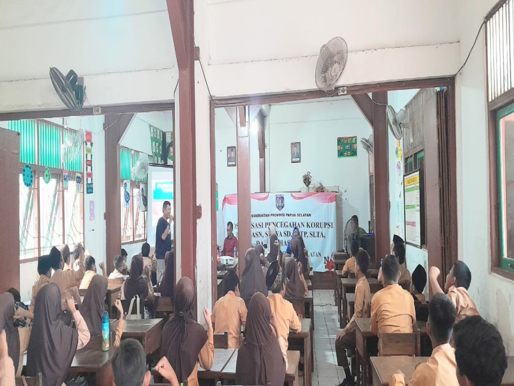 Merauke - Dalam rangka Hari Anti Korupsi 2025 pada 9 Desember nanti, jajaran Inspektorat Provinsi Papua Selatan melakukan sosialisasi anti korupsi di SD Yapis 2 Merauke, Kamis, (10/10/2025).