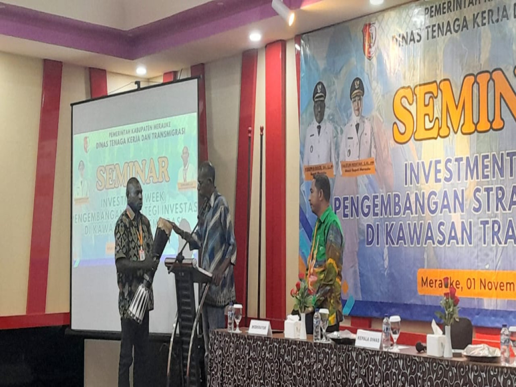 Merauke - Dinas Tenaga Kerja dan Transmigrasi Kabupaten Merauke menggelar Seminar Investment Week Pengembangan Strategi Investasi di Kawasan Transmigrasi. Diikuti dari akademisi, perwakilan OPD, UMKM, dan Kepala Kampung di kawasan Salor.