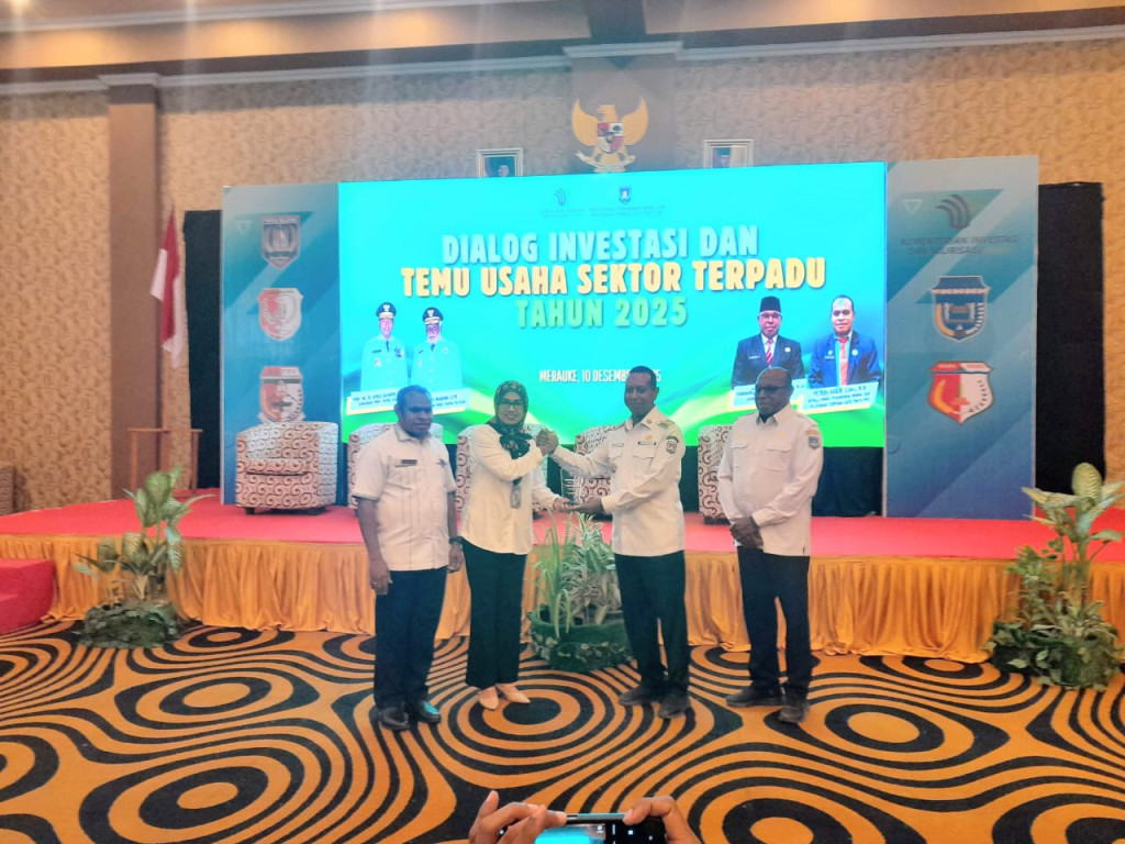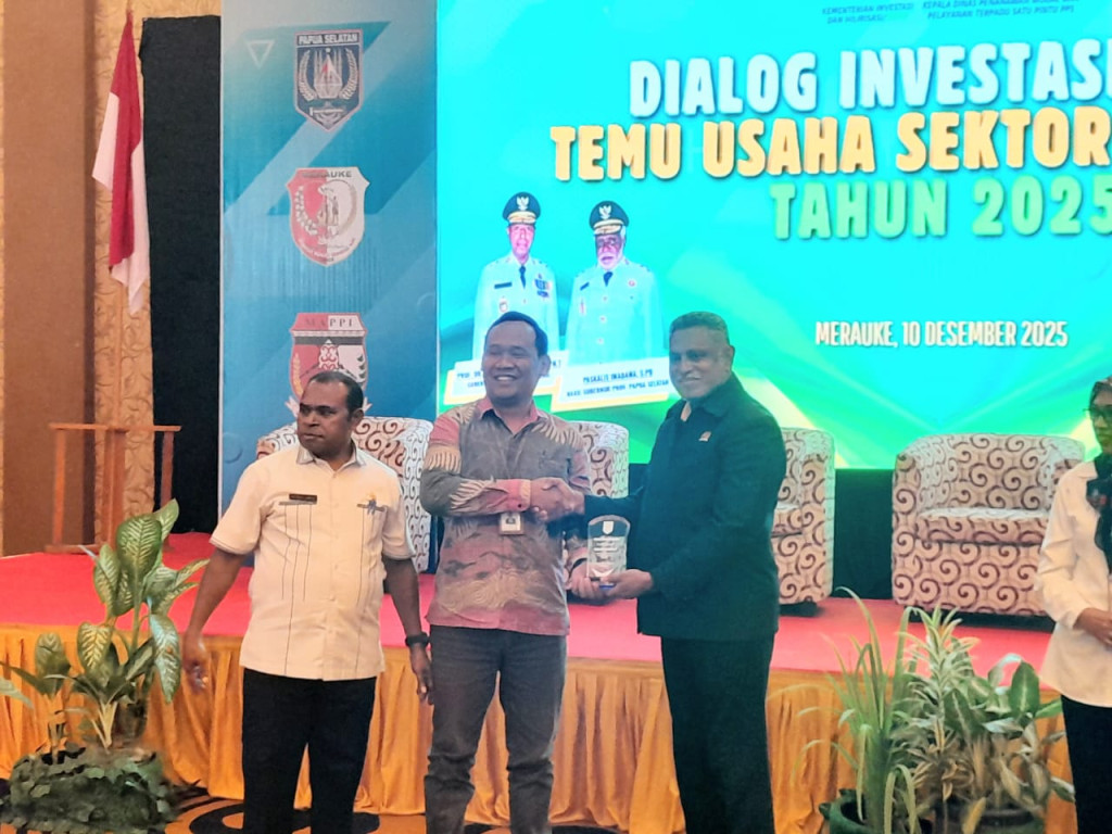 Penghargaan diserahkan oleh Gubernur Papua Selatan Apolo Safanpo dan Sekda Papua Selatan Ferdinandus Kainakaimu di sela-sela kegiatan Dialog investasi dan temu sektor terpadu tahun 2025 di Swissbelhotel Merauke, Rabu, (10/12/2025).