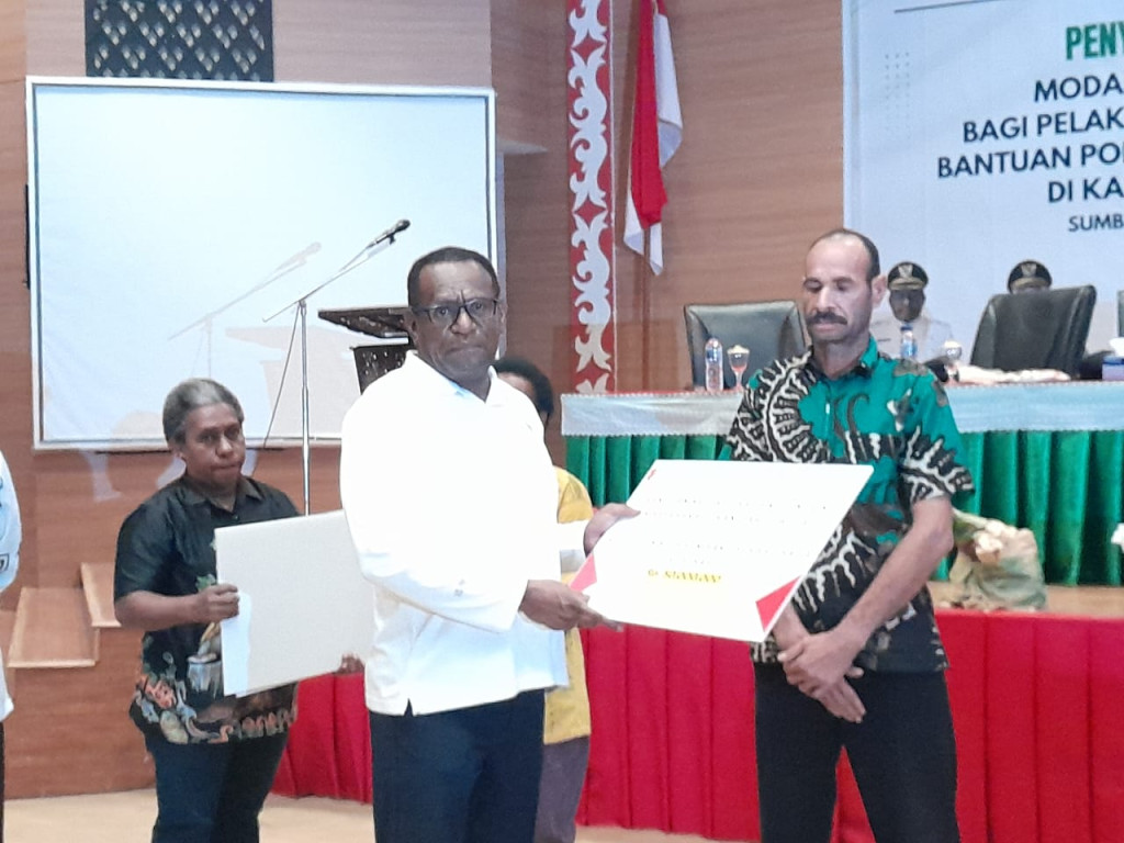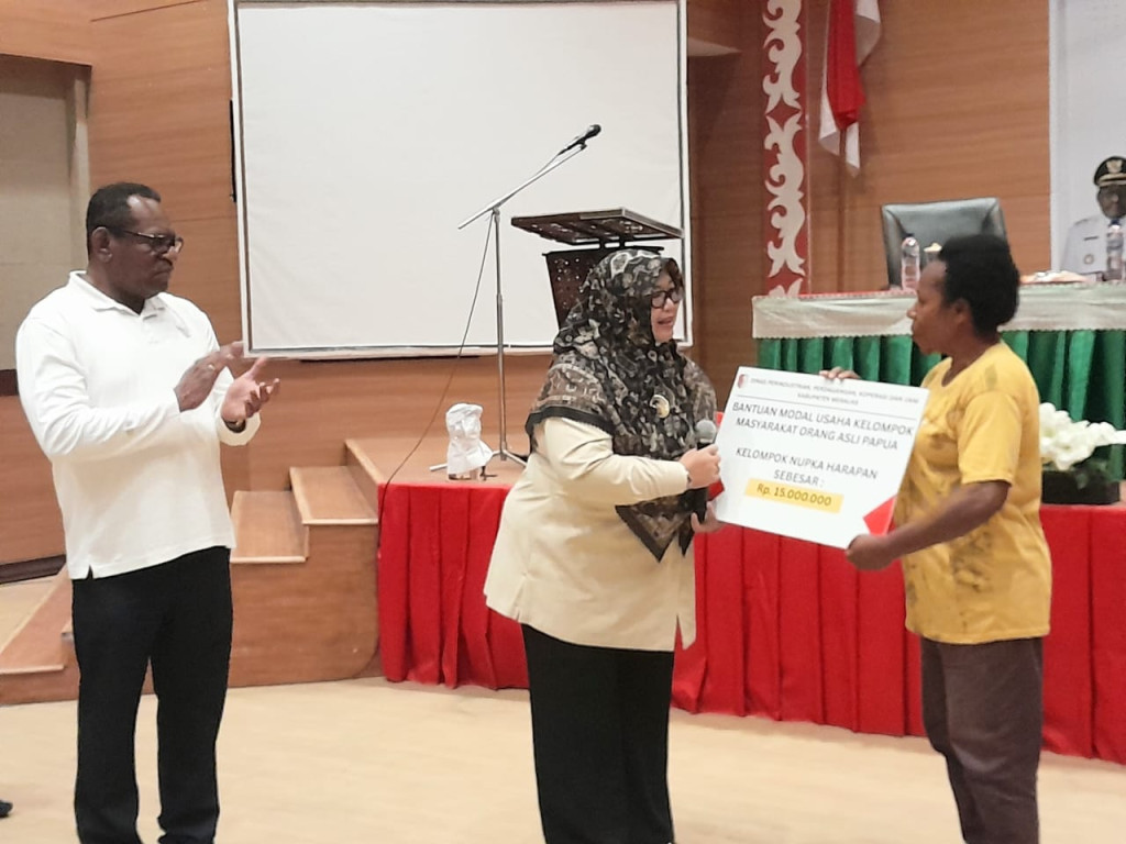 Merauke - Bupati Merauke Yoseph Bladib Gebze dan Wakil Bupati Fauzun Nihayah menyerahan bantuan modal usaha kelompok bagi pelaku UMKM dan bantuan pondok jualan mama-mama Papua di Kabupaten Merauke.