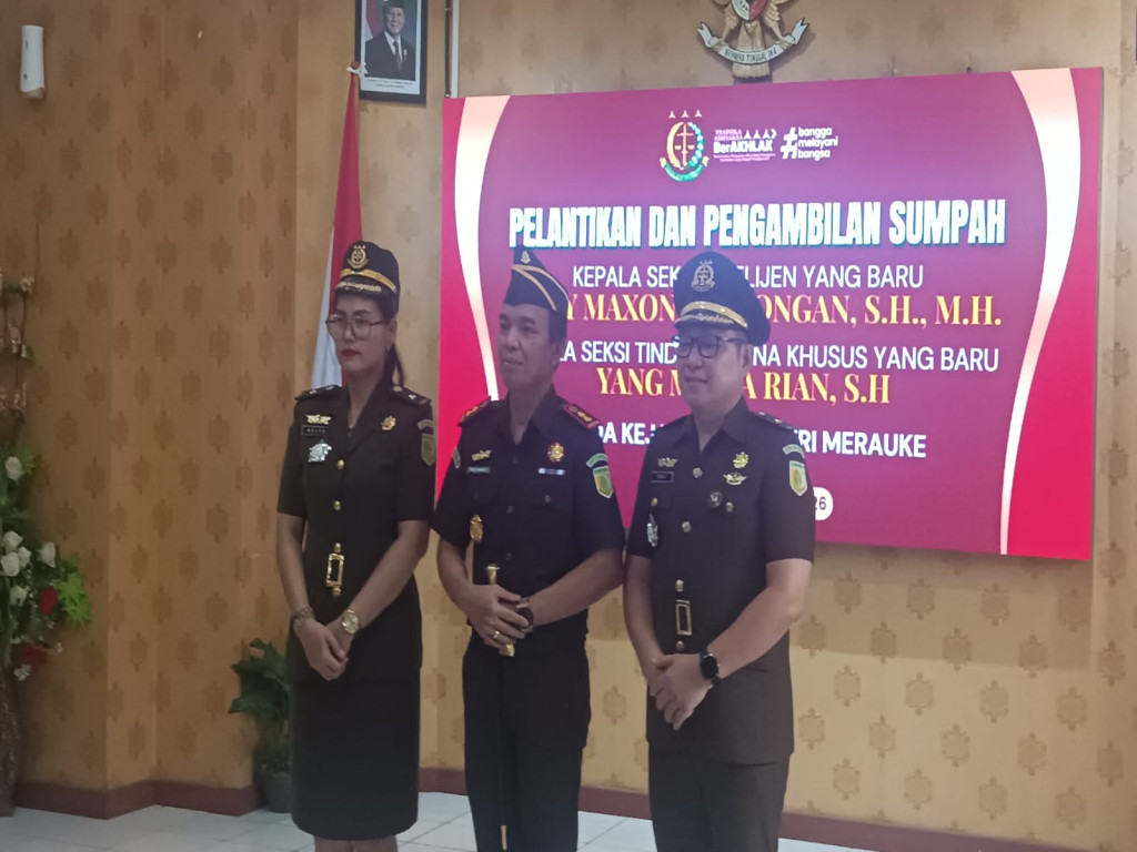 Merauke - Kepala Kejaksaan Negeri (Kajari) Merauke, Paris Manalu, SH melakukan pelantikan dan pengambilan sumpah kepada Kepala Seksi Intelijen, Pirly Maxon Momongan dan Kepala Seksi Tindak Pidana Korupsi, Yang Melva Rian, Kamis, (19/2/2026) di Kejari setempat.