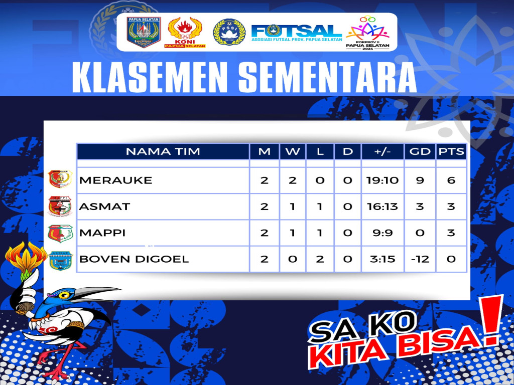Klasemen Sementara Futsal Porprov Papsel II Merauke Masih Unggul 6 Poin